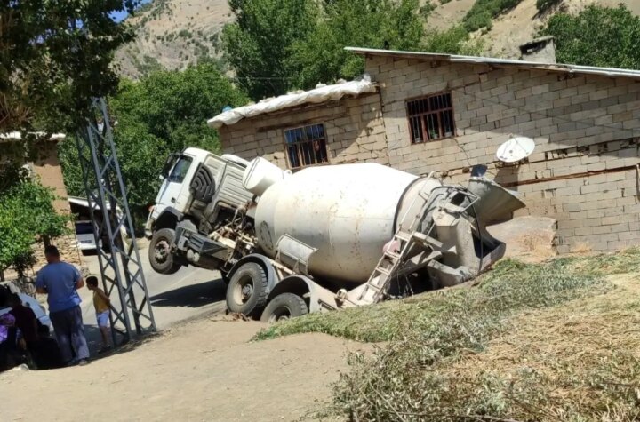 Hakkari'nin Durankaya beldesinde geri hareket yapan bir beton mikseri, bir ahırın üzerine yan yattı....