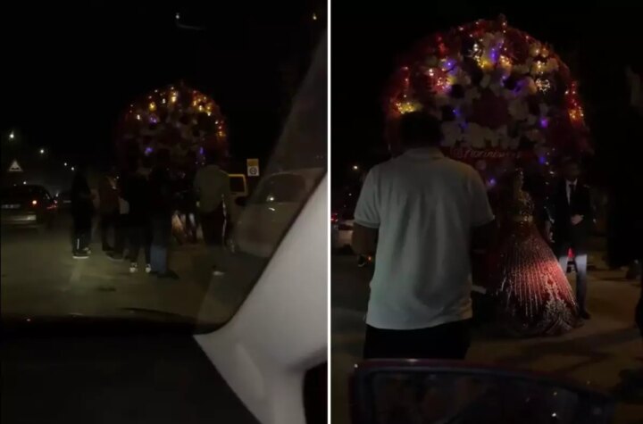 Van'da bir vatandaş, devasa buketin önünde fotoğraf çekilen gelin ile damadı kaydetmek isterken farkında...