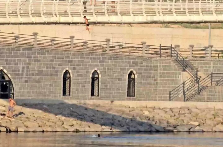 Cizre'de hava sıcaklığı nedeniyle serinlemek isteyen çocuklar, İsmail Ebul-iz Elcezeri asma köprüsünden Dicle Irmağı'na...