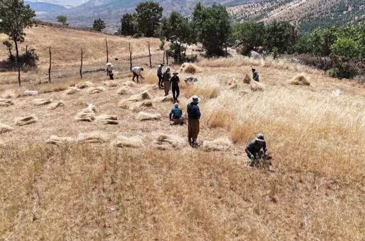 Hakkari'nin Derecik ilçesinde çiftçiler, engebeli yerde 38 derece sıcaklıkta imece yöntemi buğday hasadı yaparak...
