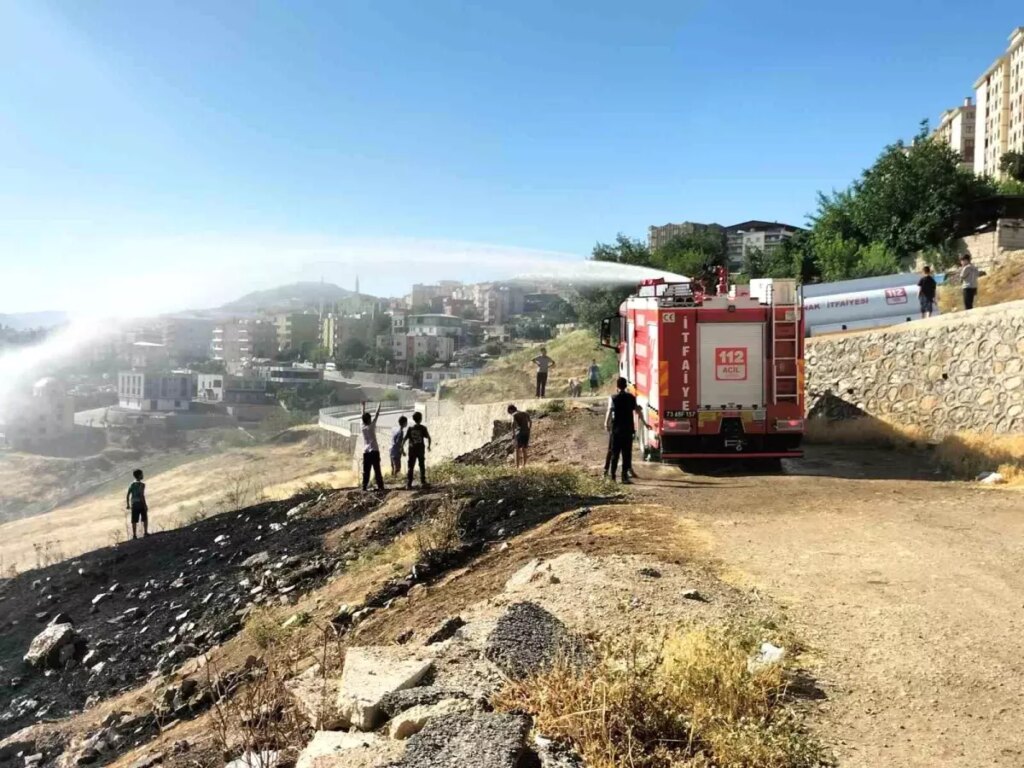 Şırnak'ta çıkan anız yangınında itfaiye gruplarının çabasına şahit olan çocuklar, tazyikli sudan faydalanarak hem serinlediler hem de eğlenceli anlar yaşadılar.