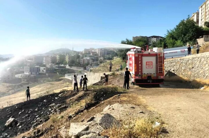 Şırnak'ta çıkan anız yangınında itfaiye gruplarının çabasına şahit olan çocuklar, tazyikli sudan faydalanarak hem...